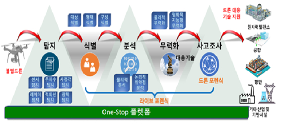 지상-공중 통합시스템은 각 지상 장비와 드론캅을 통해 레이더, RF 스캐너, 광학·적외선(EO·IR)카메라 등 여러개의 센서에서 취득한 데이터를 융합해 표적을 추적하고 AI 탐지·식별 알고리즘으로 불법드론의 물리적 형상과 통신 신호를 실시간 분석한다.