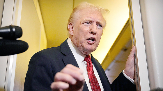 도널드 트럼프 미국 대통령이 19일(현지시간) 워싱턴 DC 백악관으로 향하는 대통령 전용기(에어포스 원) 내에서 기자들과 대화하고 있다. AP=연합뉴스 |