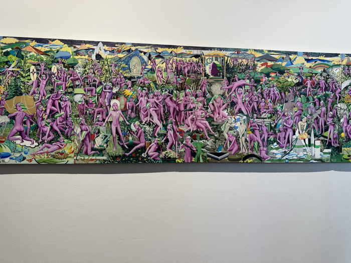 숲속에서 보랏빛 피부를 한 님프들이 화면을 가득 메운다. 이들은 벌거벗은 몸으로 거대한 바위를 들어 올리거나 뒤엉켜 몸 싸움을 벌인다. 총을 든 이, 기도하는 이가 뒤섞인다.