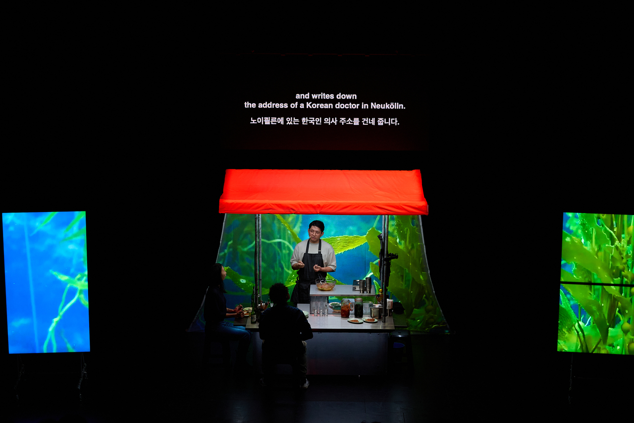 70분의 무대는 작가의 어린 시절부터 유럽에 건너가 이방인으로 살며 겪는 정체성의 고민을 담았다. 극은 포장마차의 주인장이 두 명의 손님에게 김치전, 미역냉국, 버섯 튀김, 젤리 등의 음식을 내놓으며 그것과 얽힌 이야기를 풀어낸다. 1인 화자의 다큐멘터리에 가까운 방식이다. 이야기하는 동안 포장마차 양옆으로 세워진 대형 스크린을 통해 작가가 직접 촬영한 기록 영상과 애니메이션을 보여주고, 가사가 나오는 신시사이저의 전자음악을 통해 아기자기한 감각을 더했다. 다소 단조롭고 지루할 수 있는 이야기가 완전히 다른 색깔과 정서를 입게 되는 장치들이다.