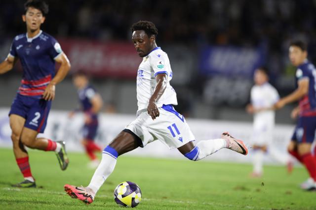 K리그2 인천 유나이티드의 제르소가 8월 24일 충북 청주종합경기장에서 열린 충북청주FC와의 26라운드 경기에서 슈팅을 시도하고 있다. 한구프로축구연맹 제공 |