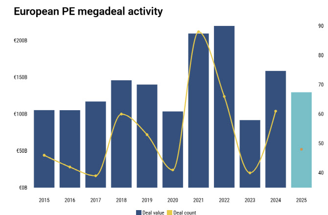 지난 2015년부터 2025년 9월 30일까지 유럽에서 발생한 PE 거래 추이. 올해 1월부터 9월까지는 역대급 규모의 메가딜이 속속 탄생했다.(사진=피치북 보고서 갈무리) |