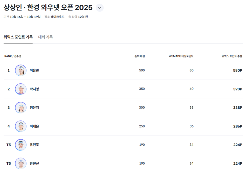 한편, KLPGA 투어 2025시즌 최강자를 가리는 최종전 위믹스 챔피언십은 오는 11월 15일부터 16일까지 이틀간 경주 마우나오션 컨트리클럽에서 열린다. 해당 대회는 정규 시즌 종료 위믹스 포인트 랭킹 상위 24명에게 출전권이 주어지며, 총상금은 10억 원, 우승 상금은 3억 원이다.