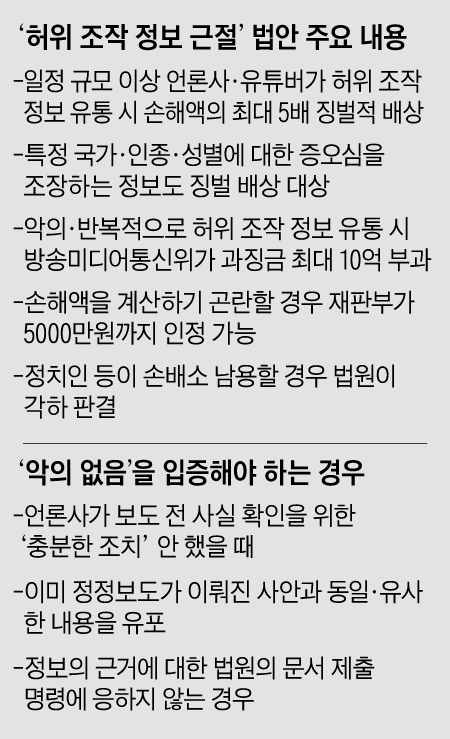 개정안의 핵심은 일정 규모 이상 언론사나 유튜버 등이 허위 조작 정보를 악의적으로 유통할 경우, 이로 인한 손해액의 최대 5배를 배상해야 하는 ‘징벌적 손해배상’ 조항이다. 여기서 ‘악의’란 타인을 해할 의도가 있는 경우다. 대상이 되는 언론사·유튜버의 기준은 구독자 수, 조회 수 등을 바탕으로 추후 대통령령으로 정하기로 했다. 조작 정보 외에, 특정 국가·인종 등에 대한 증오심을 부추기는 ‘혐오와 폭력 선동’ 정보도 유통 시 징벌 배상 대상이다.