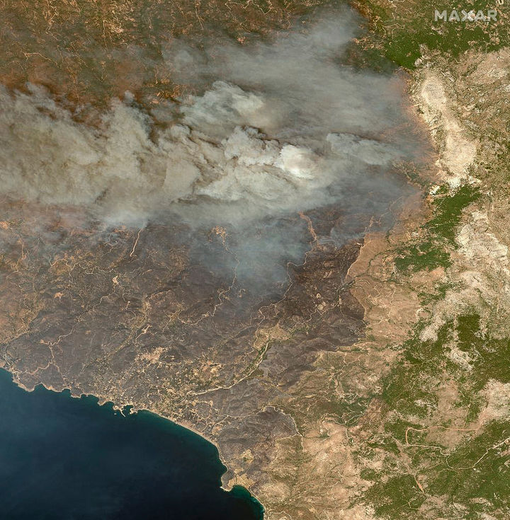[키오스=AP/뉴시스] 맥사 테크놀로지스가 제공한 위성 사진에 올해 8월13일 그리스 키오스섬에서 발생한 산불로 연기가 피어오르고 있다. 지중해와 남유럽국가 MED9국 정상들은 10월 20일 회의에서 유럽연합 국방비의 15%를 기후재앙에 투자해 달라고 요구했다. 2025. 10.21. |