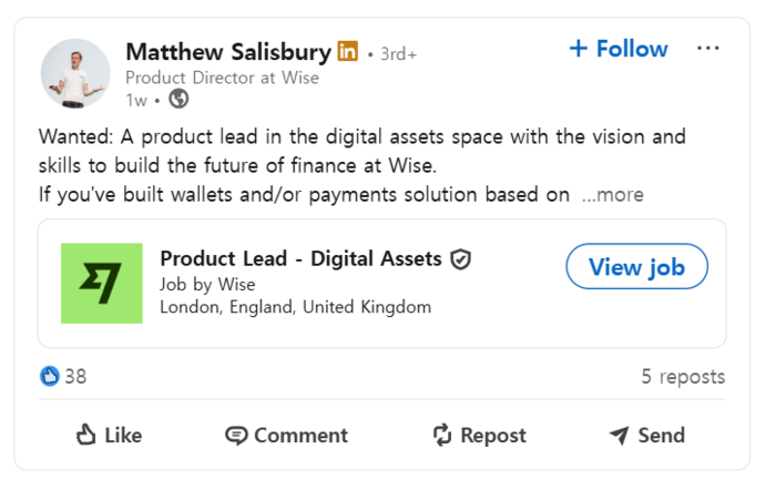 매튜 솔즈베리(Matthew Salisbury) 와이즈 제품 디렉터가 링크드인에 게시한 ‘디지털 자산 제품 책임자(Product Lead - Digital Assets)’ 채용 공고. [자료=링크드인 캡처] |