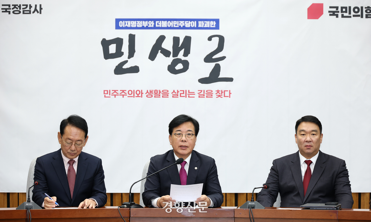 송언석 국민의힘 원내대표가 21일 국회에서 열린 국정감사 대책회의에서 발언하고 있다. 권도현 기자 |