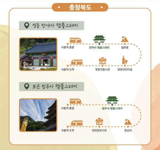 여행은 경부선을 따라 충북·충남·경북 지역 주요 사찰을 방문하는 형태로 구성됐다. 방문 사찰은 △반야사(충북 영동) △법주사(충북 보은) △신안사(충남 금산) △동화사(대구) 등 총 네 곳이다. 각 사찰에서는 차담, 유기농 쿠킹 체험, 걷기 명상, 단주 만들기 등 템플스테이 프로그램을 체험할 수 있다.