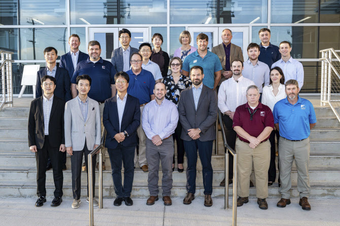 이상봉 HD현대중공업 특수선사업부 설계부문장 상무(앞줄 왼쪽 세 번째)를 비롯한 HD현대중공업 경영진이 이달 초 미국 미시시피주 소재 헌팅턴 잉걸스를 방문해 기념촬영하고 있다.(사진=HD현대) |