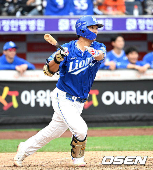 [OSEN=대전, 지형준 기자] 19일 오후 대전 한화생명볼파크에서 2025 신한 SOL Bank KBO리그 포스트시즌 플레이오프 2차전 한화 이글스와 삼성 라이온즈의 경기가 열렸다.한화는 라이언 와이스, 삼성은 최원태를 선발 투수로 내세웠다.2회초 1사 1루에서 삼성 김태훈이 좌전 안타를 날리며 기뻐하고 있다. 2025.10.19 /jpnews@osen.co.kr |
