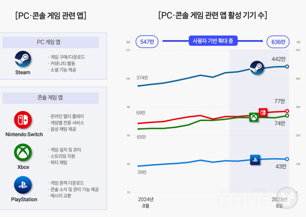 지난 2024년 8월부터 2025년 8월까지 1년간 4개 주요 플랫폼의 활성 기기 수는 547만 대에서 636만 대로 89만 대 증가하며 16%의 성장률을 기록했다. 이는 PC와 콘솔 게임 시장이 사용자 기반을 중심으로 지속적인 확대 국면에 있음을 보여주는 지표다. 특히 모바일 게임이 포화 상태에 이른 상황에서 PC·콘솔 시장이 새로운 성장 동력으로 주목받고 있다는 분석이다.