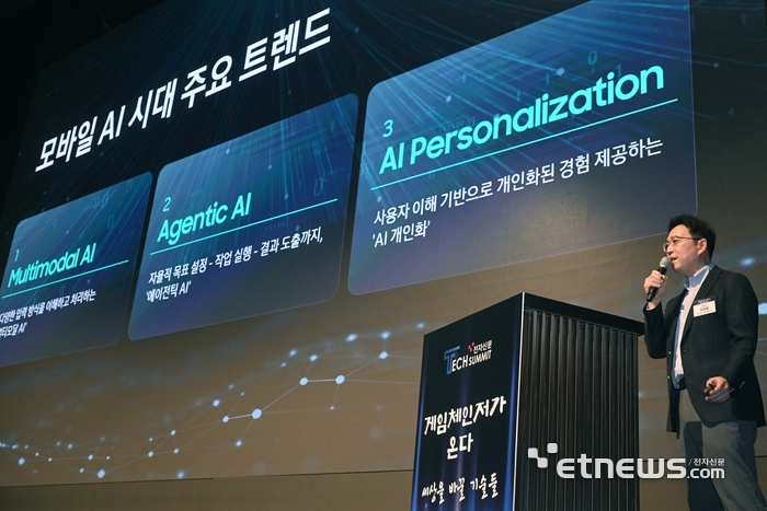 전자신문 주최한 '테크서밋'이 21일 서울 양재동 엘타워에서 열렸다. 이형철 삼성전자 MX사업부 SW프로젝트 리더가 '모바일 AI 트렌드와 발전 방향'에 대해 발표하고 있다. 박지호기자 jihopress@etnews.com |