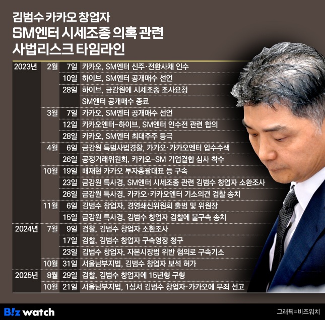 김범수 창업자와 카카오가 사법리스크에 휘말린 건 카카오가 SM엔터 인수전에 뛰어든 2023년 2월부터다. 카카오는 SM엔터 신주·전환사채를 인수하겠다는 공시했으나 약 한 달 뒤 이수만 SM엔터 창업자의 가처분 신청이 인용되면서 무산됐다.