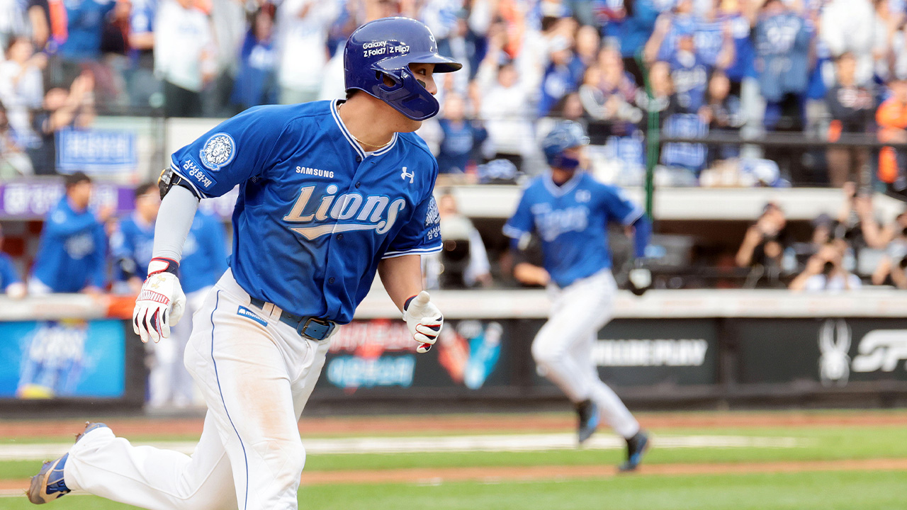 ▲ 19일 대전 한화생명 볼파크에서 열린 2025 프로야구 KBO리그 포스트시즌 플레이오프 2차전 삼성 라이온즈와 한화 이글스의 경기. 3회초 1사 2, 3루 삼성 김영웅이 2타점 적시타를 치고 1루로 향하고 있다