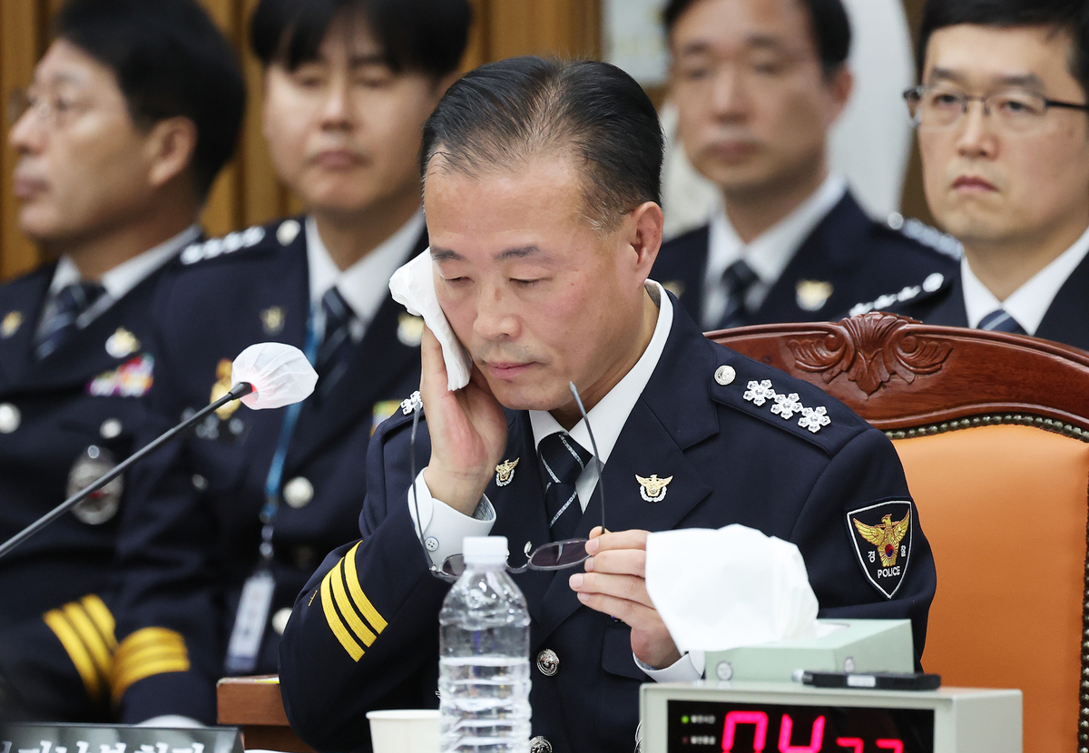 21일 경기도 수원시 장안구 경기남부경찰청에서 열린 국회 행정안전위원회의 경기남·북부경찰청에 대한 국정감사에서 황창선 경기남부청장이 땀을 닦고 있다. 연합뉴스 |