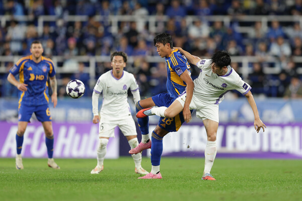 울산 HD의 허율(청색 유니폼)이 21일 열린 아시아축구연맹(AFC) 챔피언스리그 엘리트리그 스테이지 3차전에서 산프레체 히로시마 선수와 공을 다투고 있다. 한국프로축구연맹 제공 |