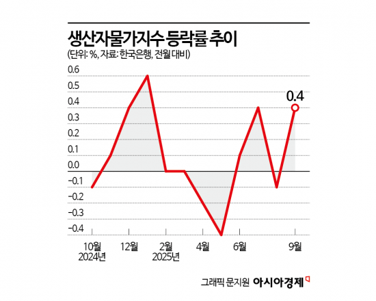 22일 한국은행이 발표한 '2025년 9월 생산자물가지수(잠정)'에 따르면 지난달 생산자물가지수는 120.54(2020년=100)로 전월 대비 0.4% 상승했다. 정보통신 및 방송 서비스, 전력 등이 오르며 한 달 만에 상승 전환했다. 지난해 같은 기간과 비교하면 1.2% 오르며 상승 폭이 확대됐다.