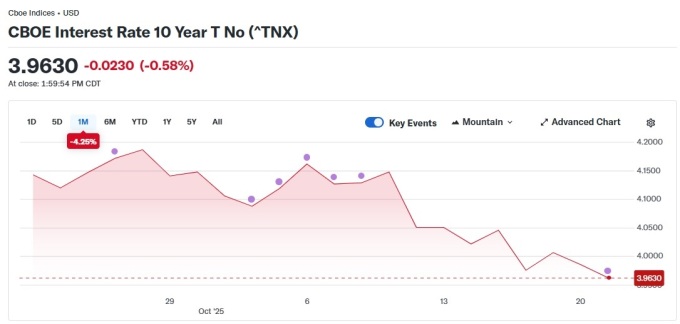 미 국채 10년물 금리 차트, 자료=야후 파이낸스, 2025.10.22 koinwon@newspim.com |