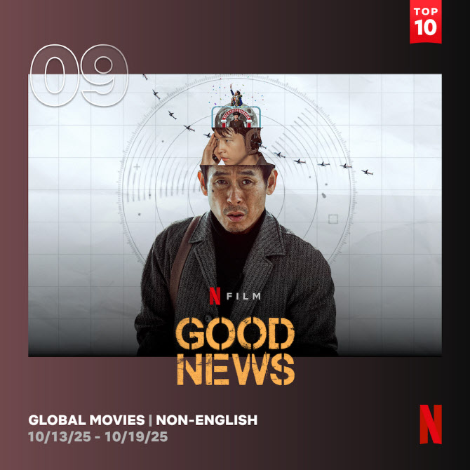 22일 넷플릭스 공식 시청 시간 및 순위 집계 사이트인 투둠에 따르면 ‘굿뉴스’는 넷플릭스 글로벌 톱10 비영어 영화 부문 10월 셋째 주(10월 13일~19일) 차트 9위에 진입했다.