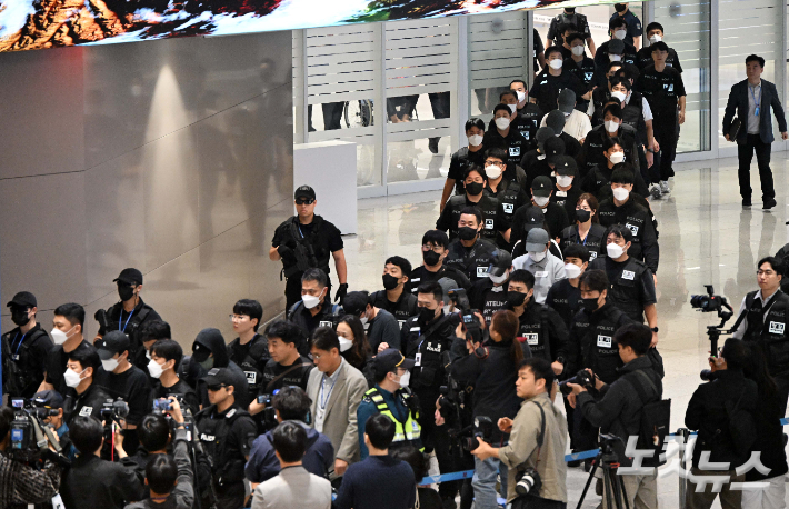 캄보디아 당국의 범죄단지 단속으로 적발돼 구금됐던 한국인들이 18일 오전 인천국제공항 2터미널을 통해 송환되고 있다. 인천공항=황진환 기자 |