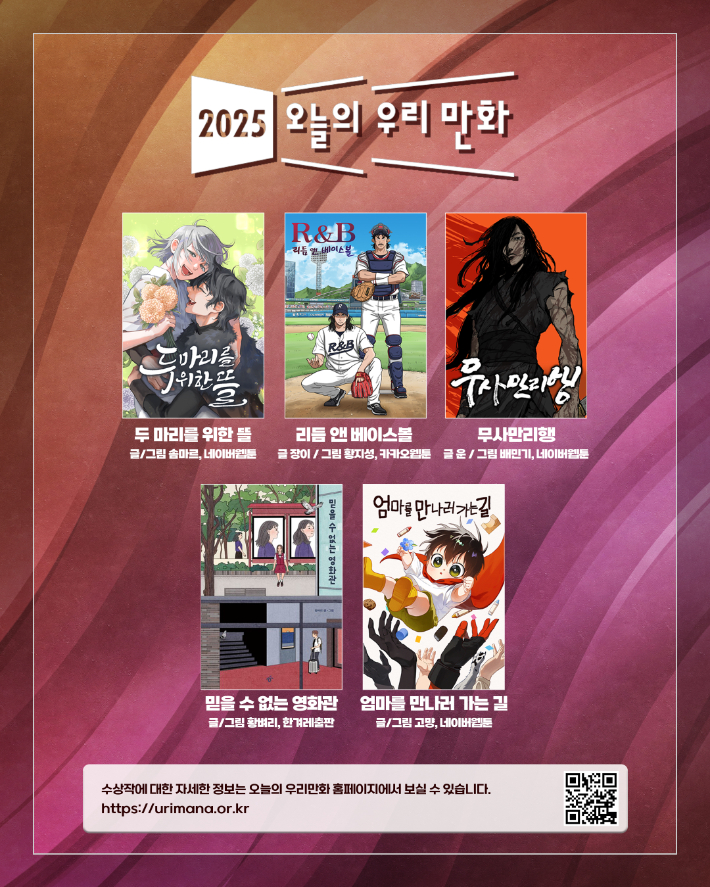 한국만화가협회(회장 신일숙)와 문화체육관광부(장관 최휘영)는 올해 '오늘의 우리만화' 수상작 5편을 선정했다고 22일 밝혔다.