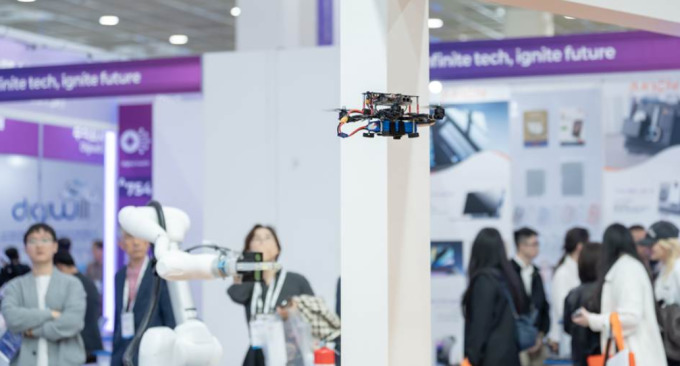 KES 2025 코엑스 A홀 고성엔지니어링 부스에서 AI 드론이 비행하며 내부를 탐색하는 모습. [사진=고성엔지니어링] |