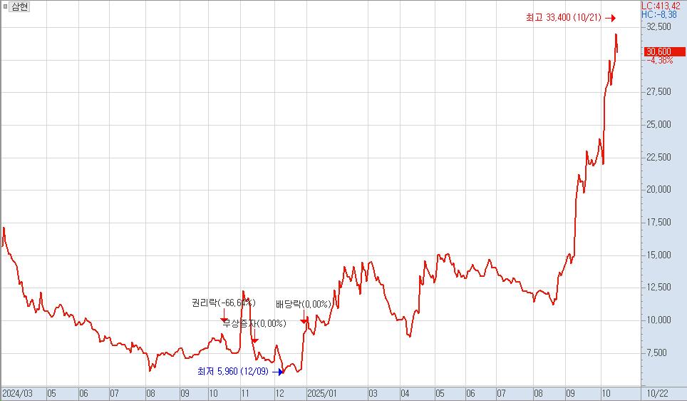시장의 기대감은 주가에도 그대로 반영되고 있다. 삼현의 주가는 작년 3월 코스닥 상장 후 연말 한때 5000원 언저리까지 내려가기도 했으나, 로봇, 방산 사업에 대한 기대감이 커지면서 급등하기 시작했다. 특히 10월 들어 급격히 오르며 3만 원대에 안착했다.