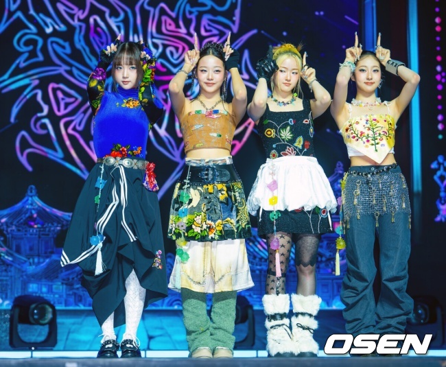 [OSEN=민경훈 기자] 22일 오후 서울 용산구 블루스퀘어 SOL트래블홀에서 비비업(VVUP) 첫 번째 미니앨범 선공개곡 'House Party' 쇼케이스가 열렸다. ‘House Party(하우스 파티)’는 VVUP(비비업-킴, 팬, 수연, 지윤)이 오는 11월 선보일 첫 번째 미니앨범의 선공개곡이다. 세련된 신스 사운드와 경쾌한 하우스 비트가 조화를 이루는 일렉트로닉 장르로, 사이버 감성과 네온 빛으로 물든 클럽 무드를 담아낸 것이 특징이다. 비비업이 무대 위에서 포즈를 취하고 있다. 2025.10.22 / rumi@osen.co.kr |