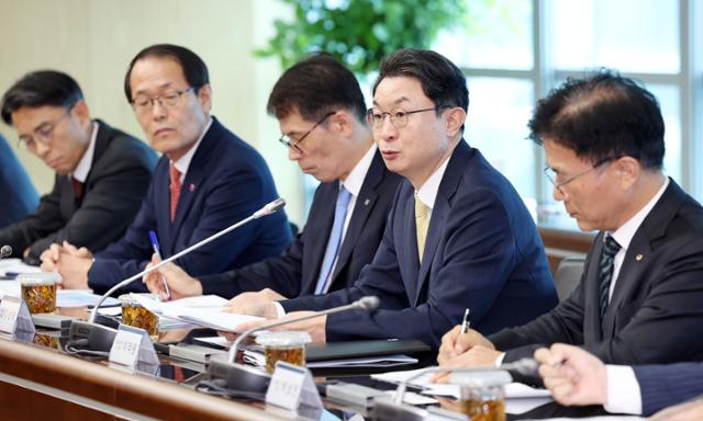 이억원(오른쪽 두번째) 금융위원장이 22일 BNK부산은행 본점에서 열린 '지역경제 활성화를 위한 지방우대금융 간담회'에서 모두발언을 하고 있다. 뉴시스 |