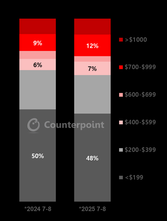 22일 시장조사기관 카운터포인트리서치에 따르면 2025년 7~8월 스마트폰 시장이 판매량 기준 전년 동기 대비 2% 성장했다. 해당기간 동안 400~599달러 및 700~999달러 가격대 스마트폰의 판매가 두 자릿수 이상 증가세를 기록했다.