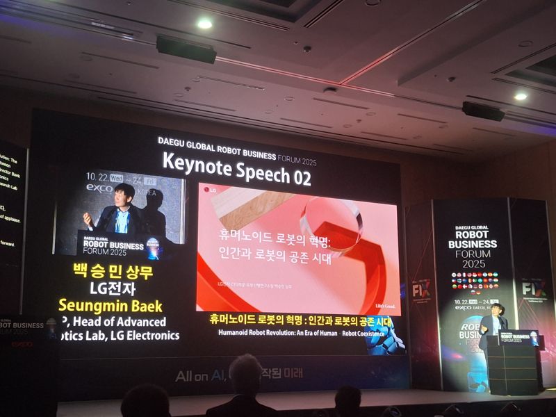 백승민 LG전자 로봇연구소장이 22일 대구 엑스코에서 열린 '2025 미래혁신기술박람회(FIX 2025)' 기조연설을 통해 휴머노이드 로봇 시장 현황과 미래에 대해 발표하고 있다. 사진=한국자동차기자협회 |