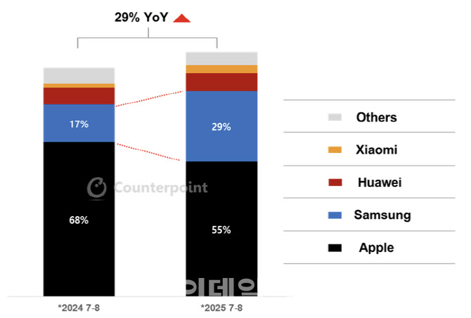 이는 전년 동기 17% 대비 12%포인트 늘어난 수치로, 같은 기간 애플은 65%에서 55%로 점유율이 줄었다. 중국 스마트폰 제조사인 샤오미와 오포 역시 고가 제품 라인업 강화로 100만원 이상 가격대에서 소폭 점유율을 늘렸다.