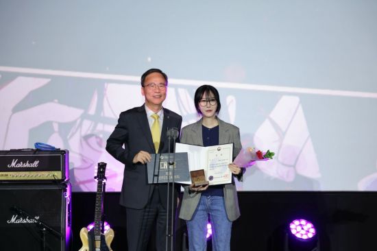 김영수 문화체육관광부 차관이 22일 롯데시네마 월드타워점 8관에서 열린 '월드 웹툰 어워즈' 시상식에서 '미래의 골동품 가게' 구아진 작가에게 대상을 수여하고 있다. |