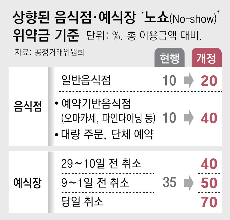 공정위 관계자는 “기존 위약금이 너무 낮다 보니 업체들이 노쇼 방지를 위해 100%에 달하는 위약금을 거는 사례까지 발생했다”며 “노쇼를 방지할 수 있는 적정한 선에서 위약금이 결정되도록 유도하려는 취지”라고 설명했다.