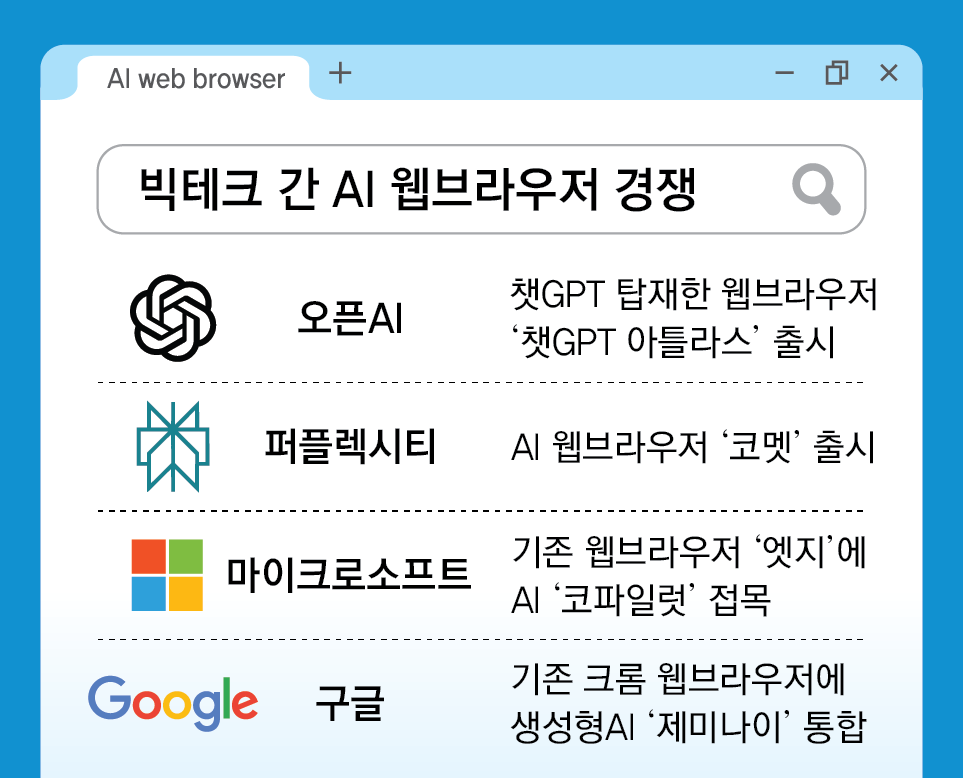 ‘구글 대항마’로 평가받는 미국 퍼플렉시티도 올 7월 AI 브라우저 ‘코멧(Comet)’을 유료로 출시한 뒤 최근 무료로 확대했다. 이에 맞서 구글은 자사 AI 모델인 ‘제미나이’를 크롬 브라우저에 통합했으며, MS도 기존 ‘엣지’ 브라우저에 자체 AI인 ‘코파일럿’을 탑재하며 고도화하고 있다.