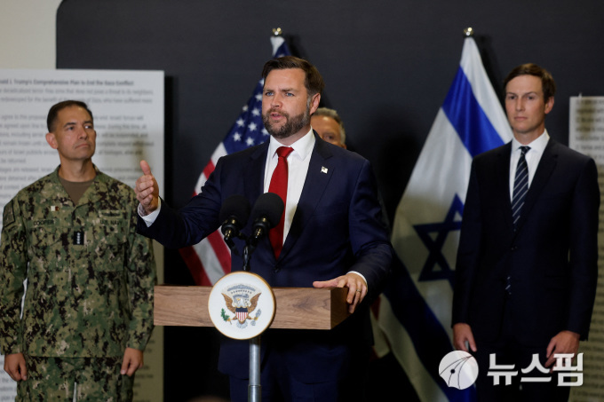 2025년 10월 21일, 이스라엘 키르얏 갓에서 JD 밴스 미국 부통령이 취재진에게 발언하고 있다.[사진=로이터 뉴스핌] |