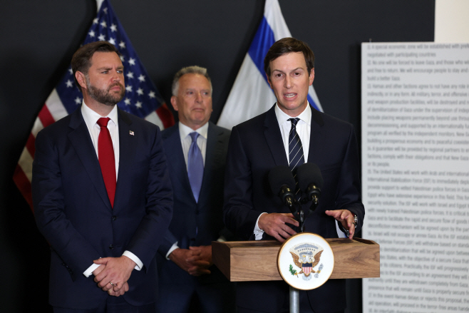 도널드 트럼프 미국 대통령의 사위인 재러드 쿠슈너(오른쪽)가 21일(현지사간) 이스라엘 남부 비공개 장소에 위치한 미국 주도의 민군협력센터(CMCC)에서 진행된 언론 브리핑에서 발언하고 있다. 이를 J.D. 밴스 미국 부통령(왼쪽)과 스티브 위트코프 미국 대통령 중동 특사가 경청하고 있다./EPA·연합 |