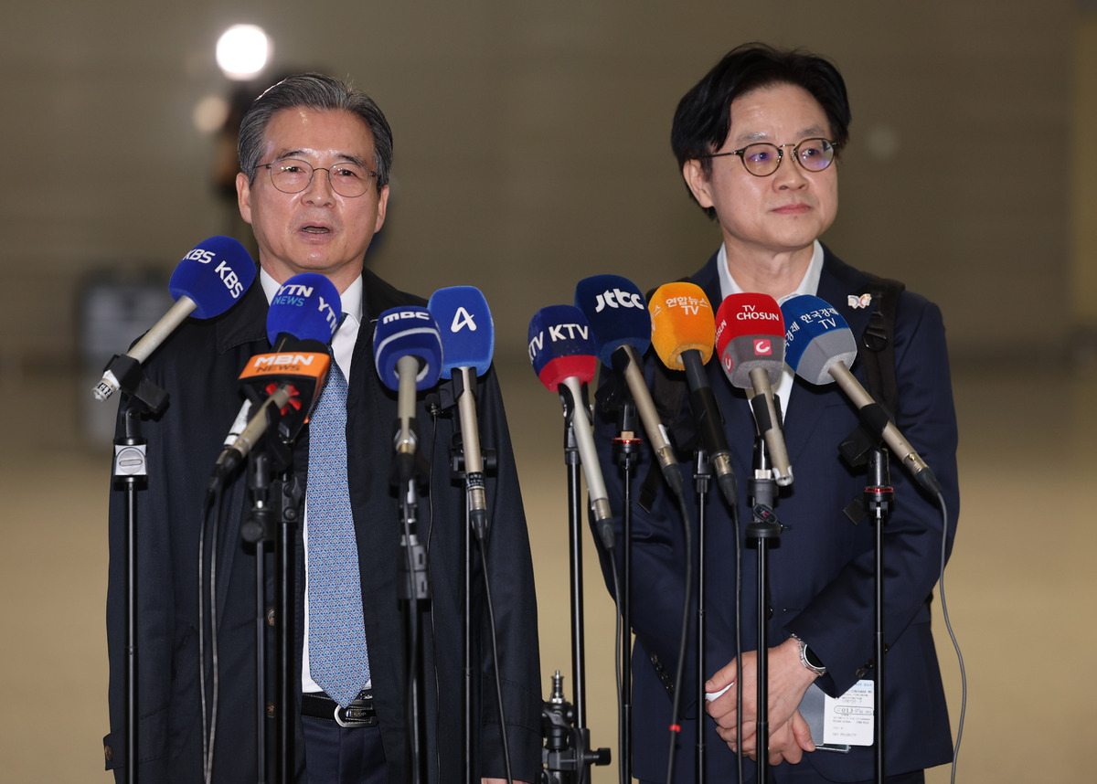 김용범 대통령비서실 정책실장이 22일 오전 인천국제공항에서 한미 관세협상 후속 협의를 위해 미국으로 출국하기 전 취재진의 질문에 답하고 있다. 오른쪽은 김정관 산업통상부 장관. 뉴시스 |