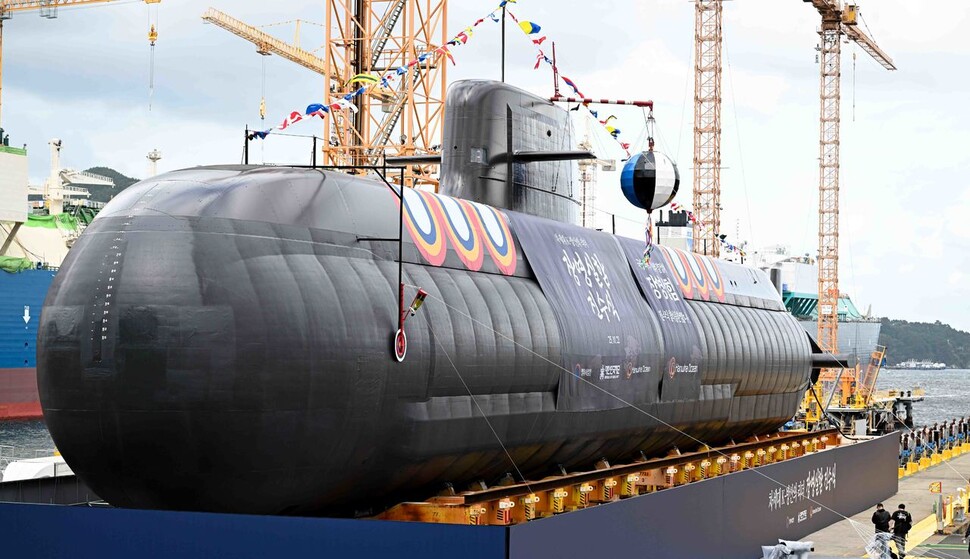 지난 22일 한화오션 거제 사업장에서 장보고‑Ⅲ 배치(Batch)‑Ⅱ 1번함 장영실함 진수식이 열리고 있다. 해군 제공 |