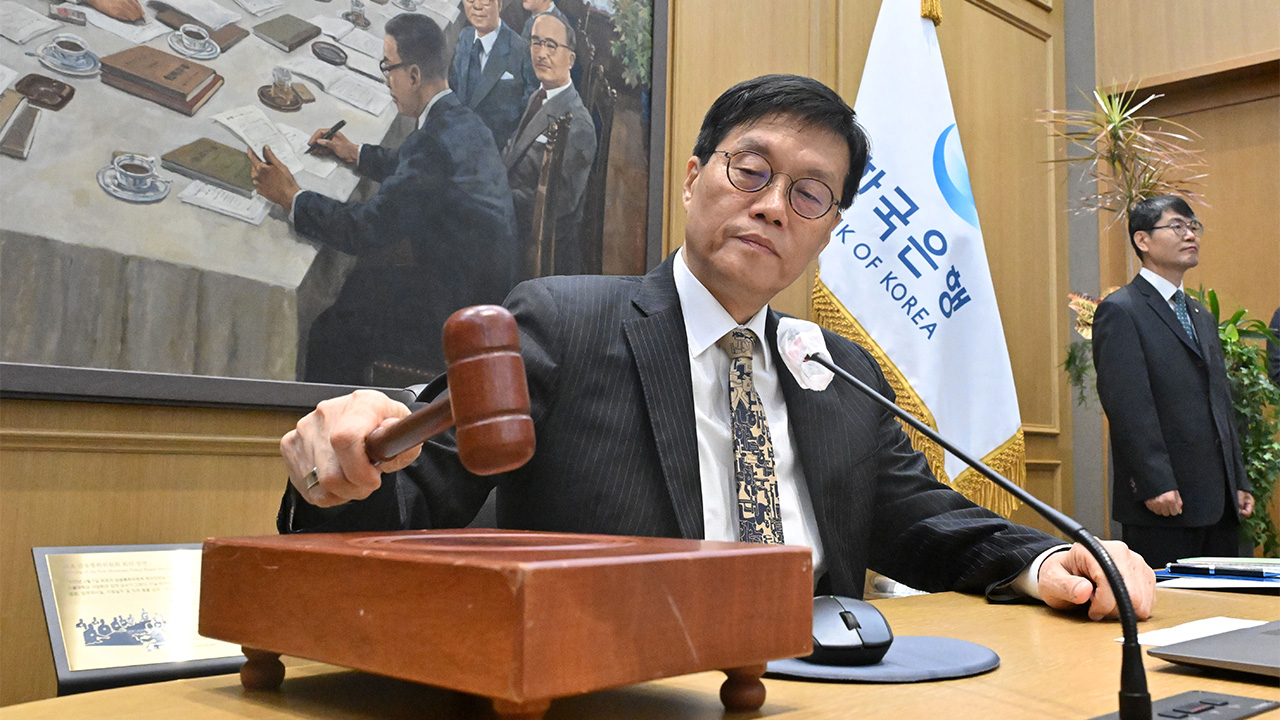 ▲ 이창용 한국은행 총재가 23일 서울 중구 한국은행 본관에서 열린 금융통화위원회 본회의에서 의사봉을 두드리고 있다.