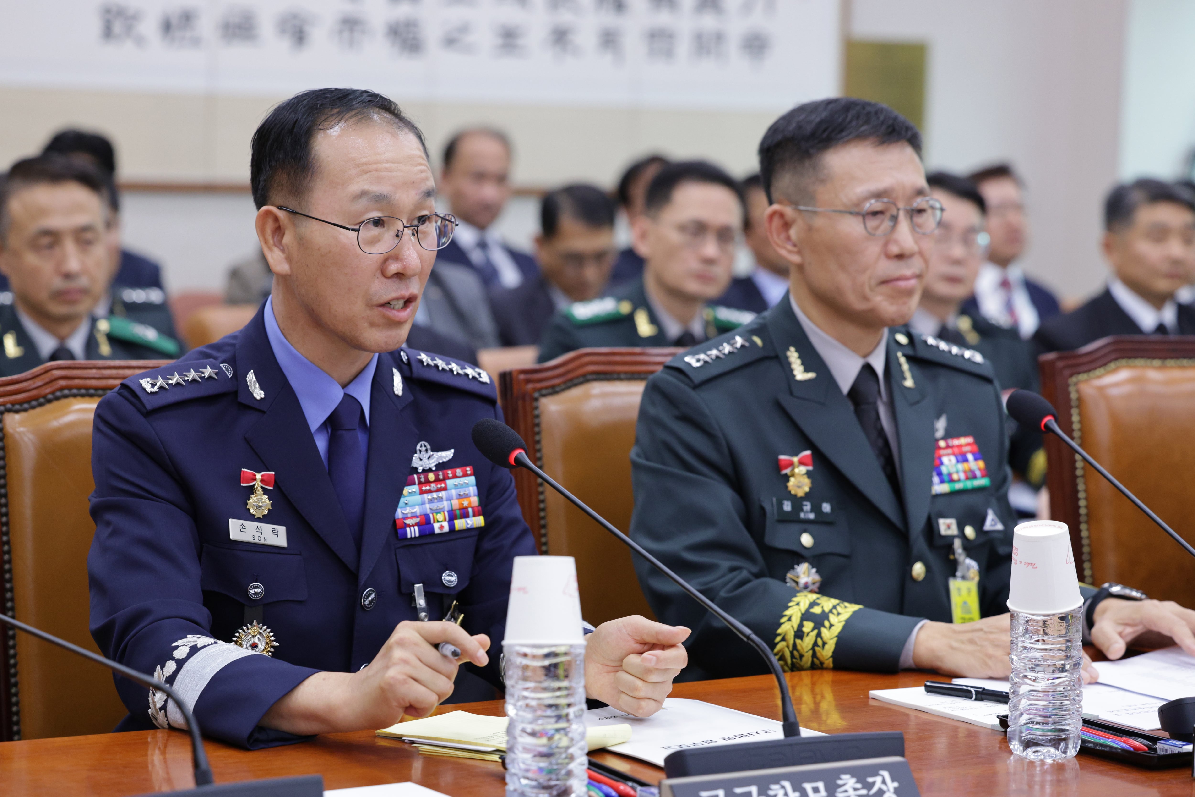 손석락(왼쪽) 공군참모총장이 지난 17일 서울 여의도 국회 법제사법위원회에서 열린 군사법원 등에 대한 국정감사에서 의원 질의에 답변하고 있다. /뉴스1 |