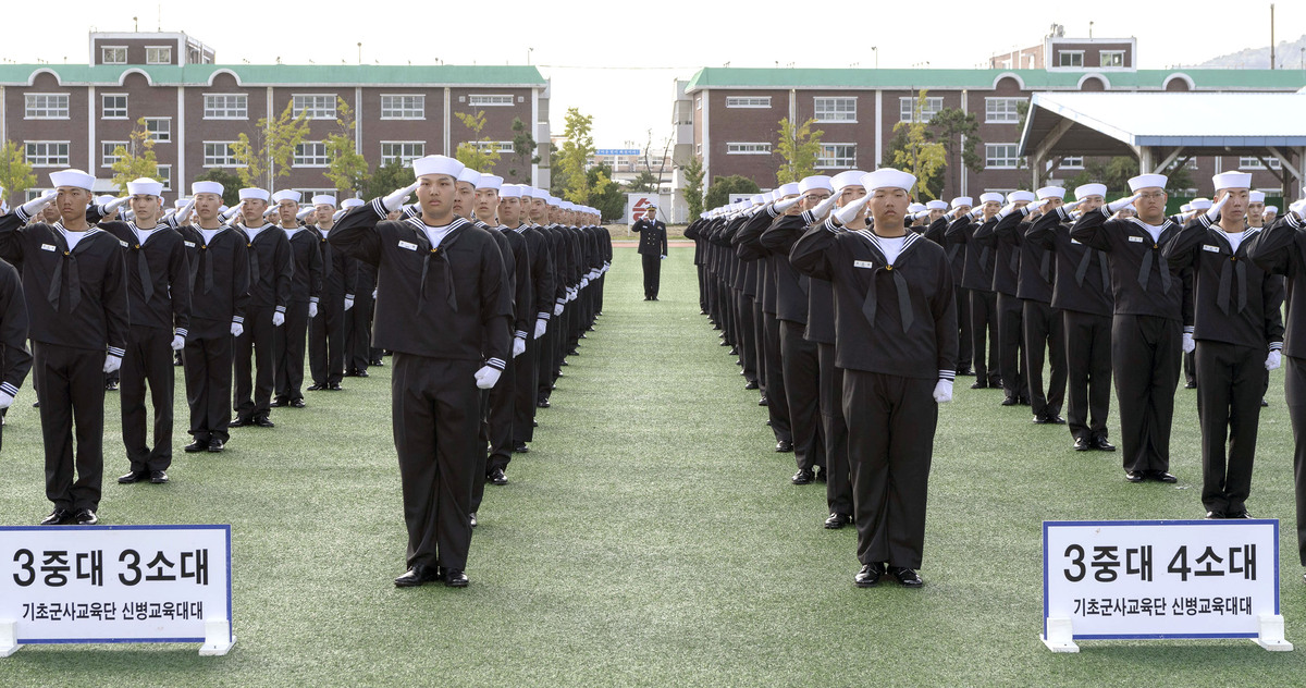 17일 경남 창원시 진해구 해군교육사령부 기초군사교육단 연병장에서 열린 해군병 717기 수료식에서 717기 해군병들이 힘차게 경례하고 있다. 해군 제공 |