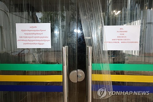캄보디아 범죄단지 건물에 붙은 벌금 안내문 |