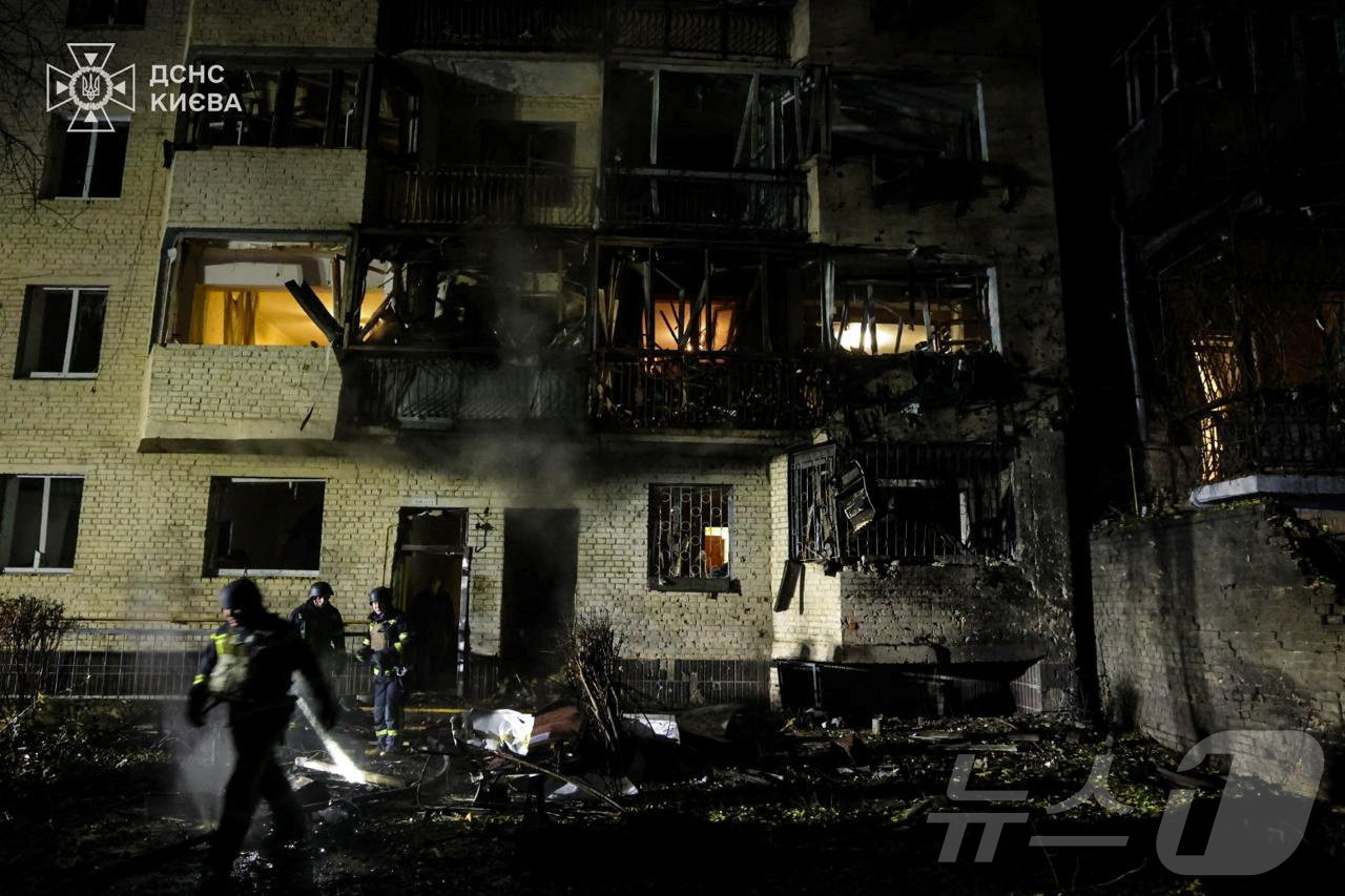 (키이우 로이터=뉴스1) 권영미 기자 = 22일(현지시간) 러시아의 드론 공격으로 피해를 입은 우크라이나 키이우 아파트 건물 현장에서 구조대원들이 작업을 벌이고 있다. ⓒ 로이터=뉴스1