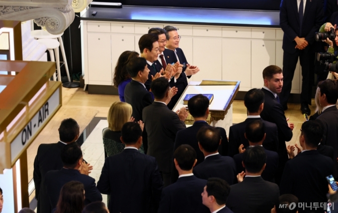 이재명 대통령이 지난 9월25일(현지 시간) 미국 뉴욕 증권거래소를 방문해 방명록을 작성한 뒤 박수치고 있다. /사진=뉴시스 |