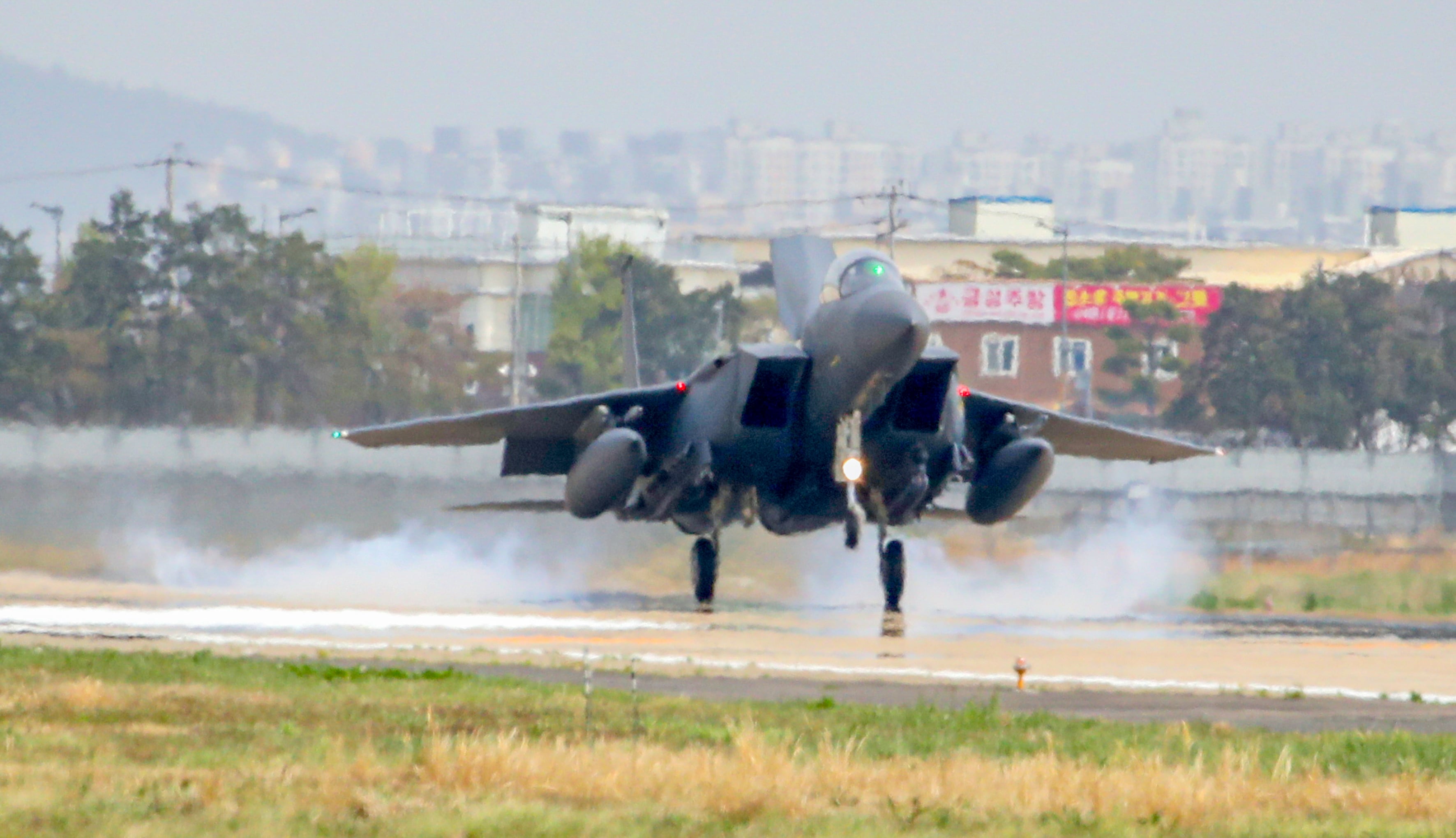 대규모 한미연합 공중훈련인 '프리덤 플래그(Freedom Flag)'가 열린 지난 4월 18일 오전 광주 광산구 공군 제1전투비행단 기지에서 한국공군 F-15K 전투기가 착륙하고 있다./김영근 기자 |