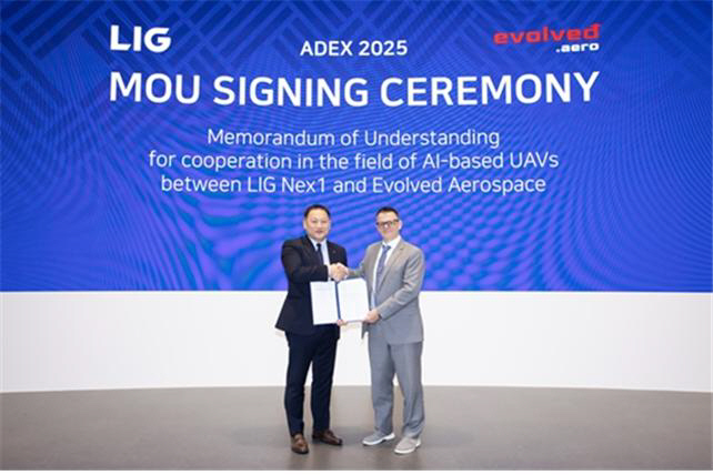 아시아투데이 한대의 기자 = LIG넥스원과 스웨덴 이볼브드에어로스페이스가 23일 AI 기반 무인헬리콥터와 드론 분야의 업무협력을 강화하는 양해각서를 체결했다. 최종진 LIG넥스원 미래전장사업부문 부문장(왼쪽)과 미카엘 타베니쿠이볼브드에어로스페이스 대표이사가 악수하고 있다.