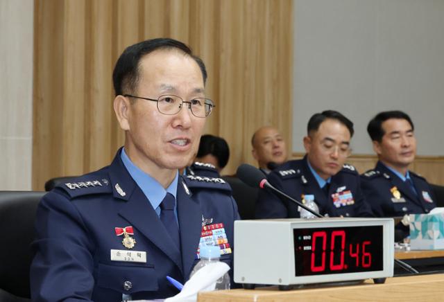 손석락 공군 참모총장이 23일 충남 계룡대에서 열린 국회 국방위원회의 공군본부에 대한 국정감사에서 위원 질의에 답변하고 있다. 계룡=뉴스1 |