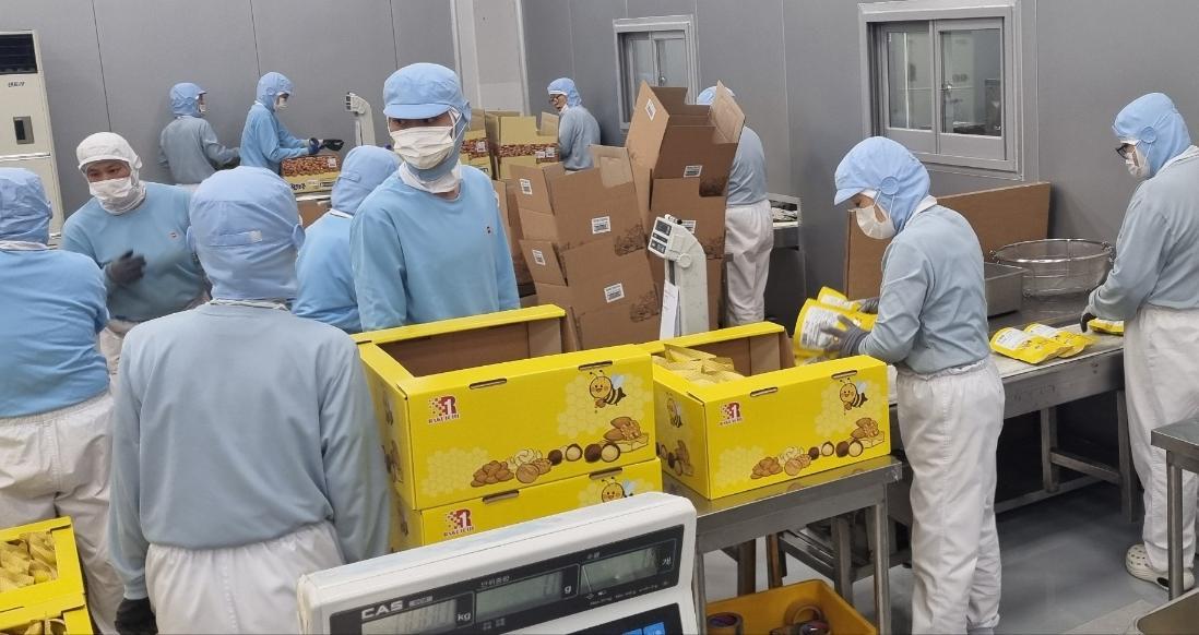 23일 오후 울산 울주군 삼남머거본 일반산업단지에 있는 세계식품 울산 신공장에서 작업자들이 머거본의 대표 견과류 스낵인 ‘허니버터 아몬드’ 출하를 앞두고 포장 작업을 하고 있다. 세계식품 제공 |