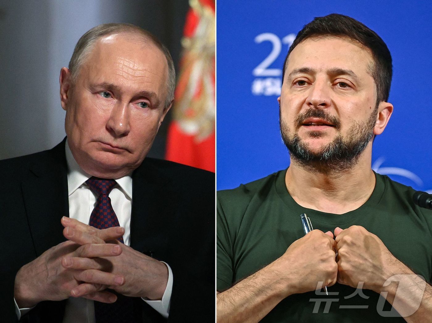 2024년 3월 12일 모스크바 크렘린에서 RIA 노보스티 통신사와 인터뷰 중인 러시아 대통령 블라디미르 푸틴의 모습과, 2024년 6월 2일 싱가포르 샹그릴라 호텔에서 열린 제21회 샹그릴라 대화 정상회의에 참석한 우크라이나 대통령 볼로디미르 젤렌스키의 모습. ⓒ AFP=뉴스1 ⓒ News1 강민경 기자 |